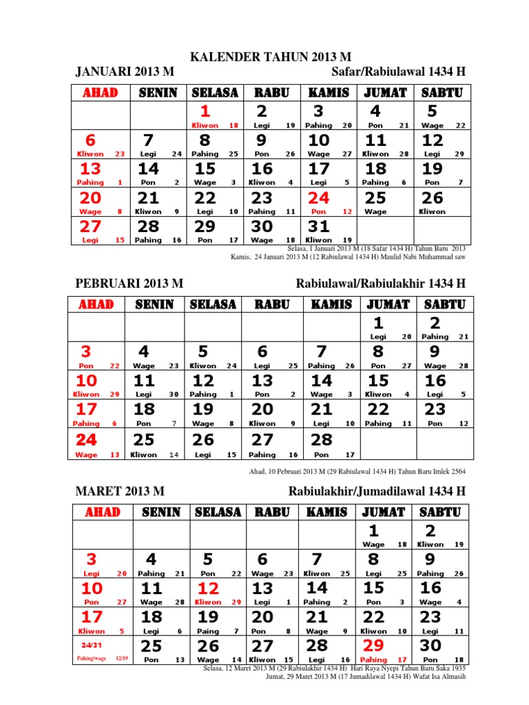 Kalender Tahun 2013 Lengkap Dengan Penanggalan Jawa Berbagai Tahun